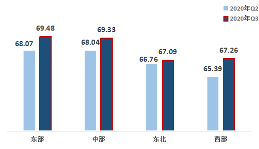 2、從區(qū)域來看,改革熱度指數(shù)值呈地域特征,東部地區(qū)略高于中部地區(qū)位列第一;但西部地區(qū)升幅明顯,東北地區(qū)以微弱差距低于西部地區(qū)。第三季度,東部、中部、東北、西部的改革熱度指數(shù)分別為69.48,69.33,67.09,67.26,比上一季度均有上升。其中,西部地區(qū)的升幅較大,東北地區(qū)升幅較小。