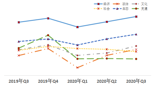 除社會(huì)、黨建領(lǐng)域外,其他領(lǐng)域熱度值均比上一季度有所提升。其中政治領(lǐng)域改革熱度值超越社會(huì)領(lǐng)域,持續(xù)呈反彈上升趨勢(shì);文化領(lǐng)域改革熱度值升幅高于政治、經(jīng)濟(jì)等領(lǐng)域。
