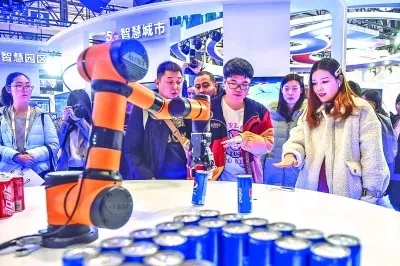 參觀者在北京一場5G大會上控制機(jī)械臂抓取飲料,體驗“隔空取物”