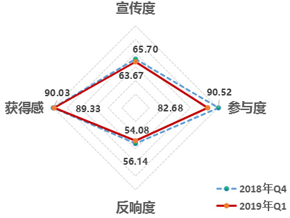 3.從維度來看,反響度呈現上升趨勢。宣傳度63.67,參與度82.68,反響度54.08,獲得感89.33。2019年第1季度,四大維度均比2018年第4季度有所下滑,其中參與度下降達7.84。從連續(xù)八個季度評估結果來看,反響度在穩(wěn)步提升,說明公眾在積極主動關注、討論各項改革。
