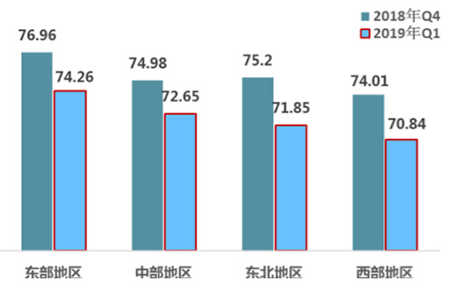 1.從區(qū)域來看,東部地區(qū)高于西部地區(qū)。一季度東部、中部、東北、西部的改革熱度指數分別為74.26、72.65、71.85、70.84,比2018年第4季度均有所下降。其中,東北地區(qū)的降幅最大,達到4.45%。從連續(xù)八個季度評估結果來看,改革熱度指數呈現出地域特征,東部地區(qū)最高,西部地區(qū)最低,兩者之間的差距呈現不斷縮小的趨勢。
