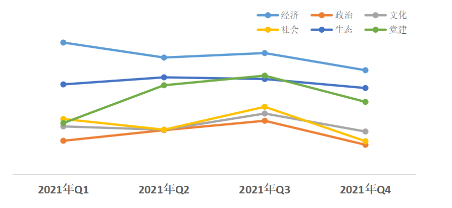 從近幾個(gè)季度的評(píng)估結(jié)果來(lái)看,除經(jīng)濟(jì)、生態(tài)領(lǐng)域,其他領(lǐng)域熱度值均在第三季度達(dá)到2021年度熱度指數(shù)峰值,但隨后呈下降趨勢(shì)。經(jīng)濟(jì)領(lǐng)域熱度值領(lǐng)先其他領(lǐng)域,政治領(lǐng)域改革熱度值偏低;社會(huì)、政治、黨建領(lǐng)域降幅較大。