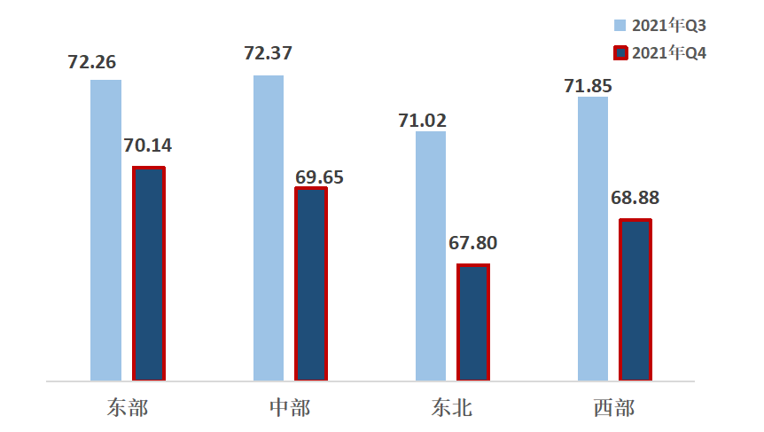 2、從區(qū)域來(lái)看,東北地區(qū)熱度指數(shù)下降明顯。東部、中部、西部、東北,指數(shù)分別為70.14、69.65、68.88、67.80。區(qū)域熱度指數(shù)呈地域特征,東部地區(qū)第一,中部地區(qū)第二,西部地區(qū)第三,東北地區(qū)最后。四大區(qū)域均比上一季度明顯下降,其中,東北、西部地區(qū)指數(shù)降幅較大。