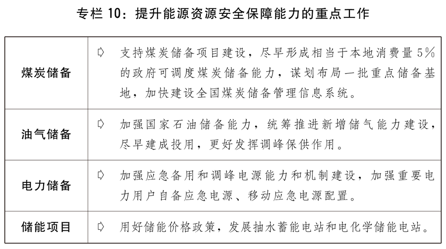 二是提升能源資源安全保障能力。深入推進煤電油氣產(chǎn)供儲銷體系建設。推進石油儲備重大工程建設,加快華北、西北等地下儲氣庫新建和擴容達容建設。有序核增一批煤炭先進產(chǎn)能,加快提升煤炭儲備能力。加強抽水蓄能等調(diào)峰電源建設,繼續(xù)發(fā)揮傳統(tǒng)能源特別是煤炭、煤電的兜底保供和調(diào)峰作用,積極推進現(xiàn)有煤電項目改造升級。推進白鶴灘、羊曲等重大水電工程建設。加大力度規(guī)劃建設以大型風光電基地為基礎、以其周邊清潔高效先進節(jié)能的煤電為支撐、以穩(wěn)定安全可靠的特高壓輸變電線路為載體的新能源供給消納體系。加快推進國家儲備建設,健全統(tǒng)一的戰(zhàn)略和應急物資儲備體系。