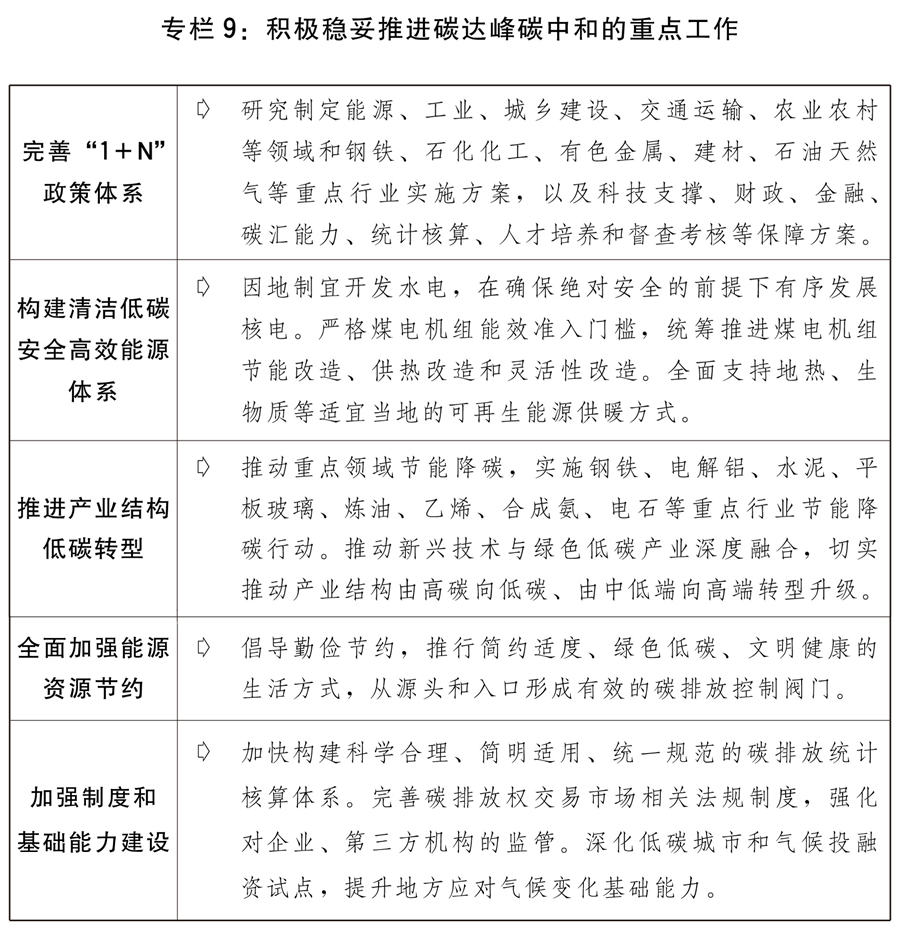 二是積極穩(wěn)妥推進碳達峰碳中和。完善碳達峰碳中和“1+N”政策體系,實施“碳達峰十大行動”,堅持“全國一盤棋”。大力發(fā)展非化石能源,建設大型風電、光伏基地項目,積極發(fā)展分布式新能源,積極推動海上風電集群化開發(fā),穩(wěn)妥推進西南等地大型水電基地建設,大力發(fā)展抽水蓄能,在確保絕對安全的前提下積極有序發(fā)展核電,推進煤炭清潔高效利用。提升電網(wǎng)對可再生能源發(fā)電的消納能力。做好全國碳排放權交易市場第二個履約周期管理。實施節(jié)能降碳改造升級。積極研究開發(fā)碳捕捉利用與封存技術。優(yōu)化完善能耗雙控政策,合理增加能耗總量彈性,新增可再生能源和原料用能不納入能源消費總量控制,推動能耗“雙控”向碳排放總量和強度“雙控”轉變。全面加強能源資源節(jié)約,強化工業(yè)、交通和建筑節(jié)能,不斷降低單位產(chǎn)出能耗物耗和碳排放。對標能效標桿水平,推動能效低于基準水平的重點行業(yè)企業(yè),有序實施改造升級,促進高耗能行業(yè)高質量發(fā)展。繼續(xù)做好碳達峰碳中和及應對氣候變化國際談判與合作,主動參與全球綠色治理體系建設,加強綠色經(jīng)貿(mào)、技術與金融合作。