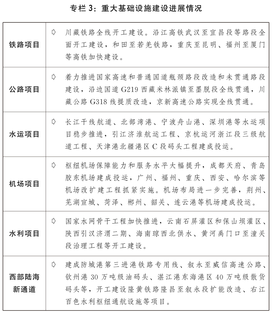 三是基礎設施發(fā)展質量效益不斷提升。川藏鐵路、西部陸海新通道、沿江高鐵等重大項目建設進展順利,烏東德水電站12臺機組全部建成投產(chǎn),雅魯藏布江下游水電開發(fā)前期工作有序推進。全年鐵路投資完成7489億元,鐵路營運總里程突破15萬公里,其中高鐵運營里程突破4萬公里,“四縱四橫”高鐵網(wǎng)全面建成,“八縱八橫”高鐵網(wǎng)正在加密形成。修訂國家公路網(wǎng)規(guī)劃和全國港口與航道布局規(guī)劃,公路水路建設穩(wěn)步推進,建成自動化碼頭10座。革命老區(qū)、沿邊抵邊基礎設施建設扎實推進。加快推進新型基礎設施建設,建成全球最大的5G獨立組網(wǎng)網(wǎng)絡。交通低碳、智能發(fā)展加快推進。