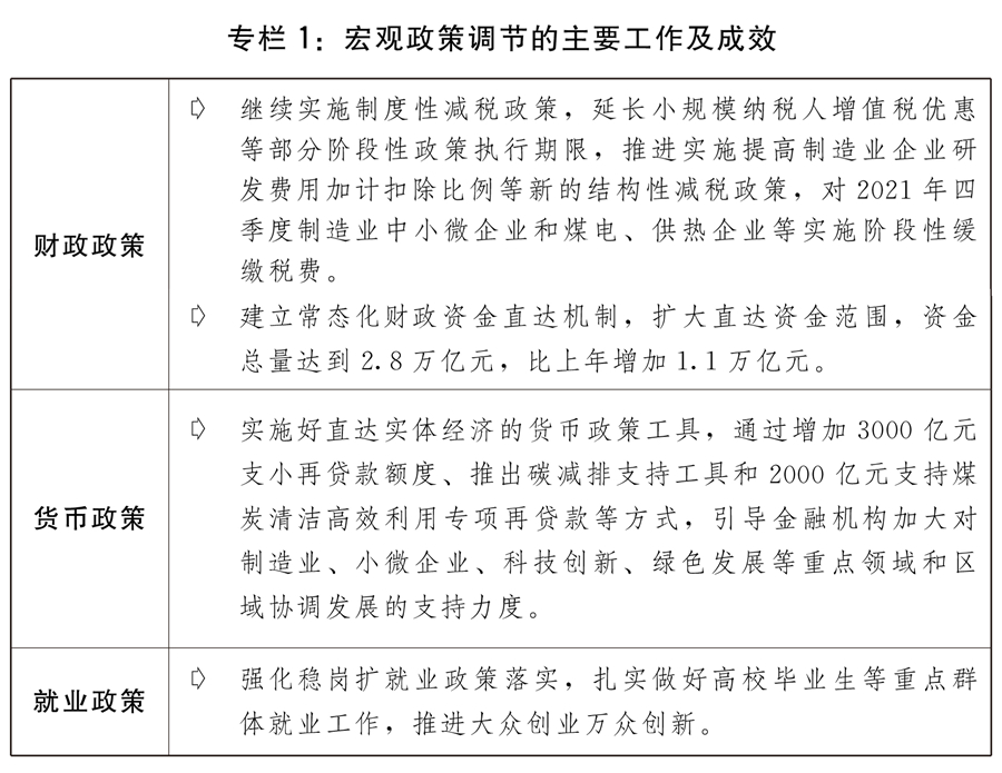 二是保持宏觀政策連續(xù)性針對性。宏觀政策適應跨周期調(diào)節(jié)需要,保持對經(jīng)濟恢復必要支持力度,同時考慮為今年應對困難挑戰(zhàn)預留政策空間。積極的財政政策提質增效、更可持續(xù)。保持必要的財政支出規(guī)模,地方政府專項債券發(fā)行使用管理進一步優(yōu)化,建立常態(tài)化財政資金直達機制,將2.8萬億元中央財政資金納入直達范圍,及時為基層?;久裆?、保工資、保運轉提供財力支持。全年新增減稅降費為市場主體減負超過1萬億元。對制造業(yè)中小微企業(yè)、煤電和供熱企業(yè)實施階段性緩繳稅費。貨幣政策靈活精準、合理適度,靈活運用降準、再貸款、再貼現(xiàn)等多種政策工具,兩次全面降準,流動性保持合理充裕,廣義貨幣供應量(M2)余額和社會融資規(guī)模存量分別增長9%和10.3%。加大對實體經(jīng)濟、重點領域和薄弱環(huán)節(jié)的支持力度,企業(yè)綜合融資成本穩(wěn)中有降,全年新增人民幣貸款19.95萬億元,比上年多增3150億元,大型商業(yè)銀行普惠小微企業(yè)貸款增幅超過40%,企業(yè)貸款平均利率為4.61%,比上年下降0.1個百分點。強化穩(wěn)崗擴就業(yè)政策落實,扎實做好高校畢業(yè)生等重點群體就業(yè)工作,推進大眾創(chuàng)業(yè)萬眾創(chuàng)新。