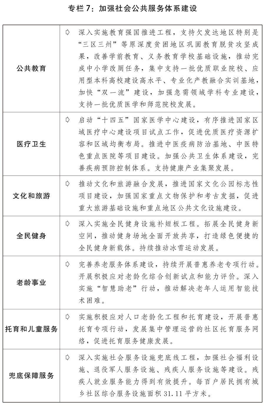 四是完善公共服務政策制度體系。分類推進基本公共服務均等化發(fā)展,推動服務重心向基層下沉,增加普惠性非基本公共服務供給。支持社會力量增加普惠性托育服務供給,進一步完善學前教育收費政策,推進普惠性學前教育資源擴容增效,推進兒童友好城市建設。推動義務教育優(yōu)質均衡發(fā)展和城鄉(xiāng)一體化,提升農(nóng)村學校辦學能力,依據(jù)常住人口規(guī)模增加城鎮(zhèn)教育資源。繼續(xù)做好義務教育階段減負工作。加強縣域普通高中建設。改善職業(yè)教育辦學條件。推進高校“雙一流”建設,加快經(jīng)濟社會發(fā)展重點領域急需學科專業(yè)建設、人才培養(yǎng)和科技攻關,完善產(chǎn)教融合政策措施。支持中西部高等教育發(fā)展,高校招生繼續(xù)加大對中西部和農(nóng)村地區(qū)傾斜力度。加強教師隊伍建設,加大中西部地區(qū)教師培訓力度。辦好特殊教育、繼續(xù)教育,規(guī)范民辦教育發(fā)展。完善三孩生育政策配套措施,將3歲以下嬰幼兒照護費用納入個人所得稅專項附加扣除,推動生育支持政策落地見效。貫徹落實積極應對人口老齡化國家戰(zhàn)略,加強養(yǎng)老托育服務體系和健康支撐體系建設,維護好老年人合法權益。推動公立醫(yī)院高質量發(fā)展,加快健全現(xiàn)代醫(yī)院管理制度,深入推進國家醫(yī)學中心、國家區(qū)域醫(yī)療中心建設項目和縣級醫(yī)院建設,加快完善分級診療體系,深化醫(yī)療服務價格、醫(yī)保支付管理和公立醫(yī)院薪酬制度改革。補齊婦幼兒科、精神衛(wèi)生、老年醫(yī)學等服務短板。持續(xù)深入開展愛國衛(wèi)生運動、推進實施健康中國行動,倡導文明健康綠色環(huán)保生活方式。實施現(xiàn)代化疾控體系建設、國家重大傳染病防治基地建設等工程,提升公共衛(wèi)生防控救治能力。加快中醫(yī)藥特色發(fā)展。推動中華優(yōu)秀傳統(tǒng)文化創(chuàng)造性轉化和創(chuàng)新性發(fā)展,促進出版、電影、廣播電視、文物等事業(yè)高質量發(fā)展,推進公共文化數(shù)字化建設,提供更多公共文化產(chǎn)品。加強國家重大文化項目和國家文化公園建設,加強重要文化遺產(chǎn)和國家公園等重要自然遺產(chǎn)保護設施建設,全面提升革命文物保護利用水平,促進公共文化服務提質升級。推進國民旅游休閑加快發(fā)展,不斷完善節(jié)假日制度。實施全民健身設施補短板工程,加強體育公園等全民健身場地設施建設。深化公共法律服務體系建設。