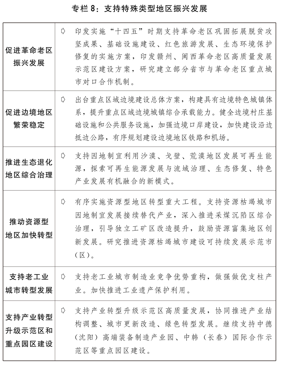 二是提高區(qū)域協(xié)調(diào)發(fā)展水平。推動西部大開發(fā)形成新格局,發(fā)揮風、光、水電和礦產(chǎn)資源優(yōu)勢建設大型清潔能源基地。積極發(fā)展文化和旅游產(chǎn)業(yè)。實施重要生態(tài)系統(tǒng)保護和修復工程,加快重大項目規(guī)劃建設。推進貴州大數(shù)據(jù)綜合試驗區(qū)建設。積極穩(wěn)妥推進雅魯藏布江下游水電開發(fā)等重大工程。推動東北振興取得新突破,組織實施好東北全面振興“十四五”實施方案,繼續(xù)推進黑瞎子島中俄國際合作示范區(qū)建設,積極推動大小興安嶺林區(qū)生態(tài)保護與經(jīng)濟轉型,穩(wěn)步推進長吉圖開發(fā)開放先導區(qū)發(fā)展,推動《東北振興重點項目三年滾動實施方案》重點項目加快建設。推動中部地區(qū)高質量發(fā)展,推動湘鄂贛協(xié)同高質量發(fā)展,支持晉陜豫黃河金三角承接產(chǎn)業(yè)轉移示范區(qū)建設,支持山西進一步深化能源革命綜合改革試點,推進淮海合作區(qū)協(xié)同發(fā)展,支持中國(武漢)光谷建設,編制出臺洞庭湖生態(tài)經(jīng)濟區(qū)規(guī)劃。鼓勵東部加快高質量發(fā)展,支持福建高質量發(fā)展及平潭綜合實驗區(qū)建設,推動山東新舊動能轉換綜合試驗區(qū)建設取得新進展。支持民族地區(qū)改善生產(chǎn)生活條件,加強各民族交流交往交融,鑄牢中華民族共同體意識。推動革命老區(qū)、邊境地區(qū)、生態(tài)退化地區(qū)、資源型地區(qū)、老工業(yè)城市等特殊類型地區(qū)振興發(fā)展,推進國家級新區(qū)、臨空經(jīng)濟示范區(qū)、承接產(chǎn)業(yè)轉移示范區(qū)等功能平臺建設,推動國家自主創(chuàng)新示范區(qū)和高新區(qū)高質量發(fā)展。支持海洋經(jīng)濟發(fā)展示范區(qū)、現(xiàn)代海洋城市等建設,提升海洋資源開發(fā)利用水平。