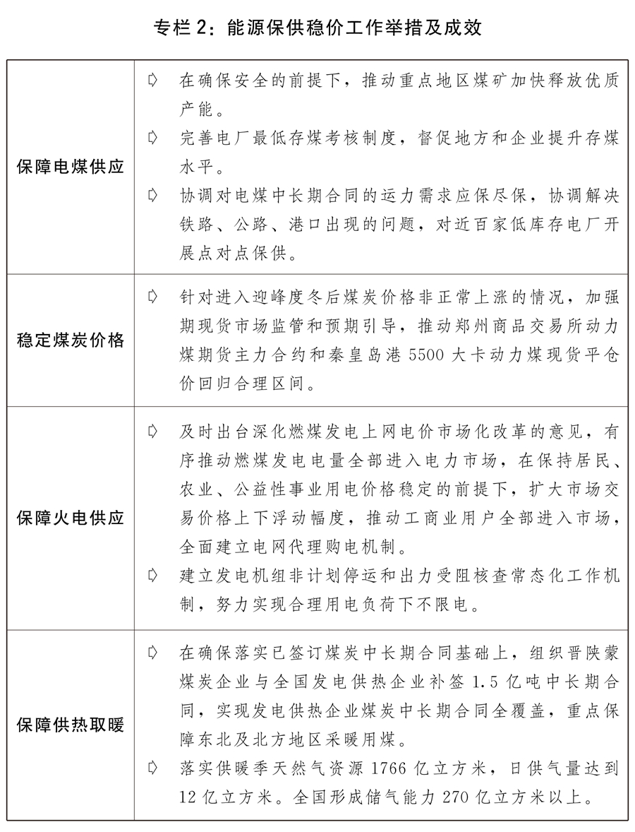 三是糧食能源等重要資源保供穩(wěn)價工作有力有效。針對玉米、煤炭、鐵礦石、銅鋁鋅等大宗商品價格異常波動,及時采取供需雙向調(diào)節(jié)、期現(xiàn)貨市場聯(lián)動監(jiān)管、預期引導等措施,打出保供穩(wěn)價的政策組合拳,有力促進了價格回歸合理區(qū)間。加強糧食市場調(diào)控,合理安排進口和政策性糧食庫存銷售,有效保障糧食市場穩(wěn)定供應。加強期貨市場監(jiān)管和新棉收購引導,適時增加中央儲備棉投放,促進棉花市場平穩(wěn)有序運行。著力解決煤炭電力供應緊張問題,推動煤炭增產(chǎn)增供和價格回歸合理水平,支持發(fā)電供熱企業(yè)紓困解難,提升煤電支撐保障能力,改革完善煤電價格市場化形成機制,擴大市場交易價格上下浮動幅度,加強煤炭、液化天然氣(LNG)等能源物資產(chǎn)運需銜接和運輸保障,確保民生和公共用能需求,推進全社會節(jié)約用電。發(fā)揮跨部門協(xié)調(diào)工作機制作用,做好化肥市場保供穩(wěn)價工作。制定實施原材料價格上漲應對方案以及分品種保供穩(wěn)價工作方案。發(fā)揮國家儲備市場調(diào)節(jié)作用,分批投放原油成品油和銅鋁鋅等國家儲備。