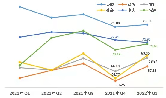1、從領(lǐng)域來看,經(jīng)濟(jì)領(lǐng)域增幅低于其他領(lǐng)域。第一季度,經(jīng)濟(jì)領(lǐng)域得分75.54,政治領(lǐng)域得分67.18 ,文化領(lǐng)域得分68.87,社會(huì)領(lǐng)域得分69.36,生態(tài)領(lǐng)域得分71.95,黨建領(lǐng)域得分71.66。與上一季度相比,生態(tài)領(lǐng)域小幅下降,其他五個(gè)領(lǐng)域均上升。其中社會(huì)領(lǐng)域升幅最大,政治領(lǐng)域次之,經(jīng)濟(jì)領(lǐng)域提升最小。