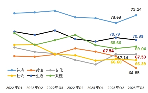 從改革熱度指數(shù)的六大領(lǐng)域來看,經(jīng)濟(jì)領(lǐng)域75.14,政治領(lǐng)域64.85,文化領(lǐng)域67.53,社會(huì)領(lǐng)域66.39,生態(tài)領(lǐng)域70.33,黨建領(lǐng)域69.04。與上一季度相比,經(jīng)濟(jì)、黨建領(lǐng)域上升。