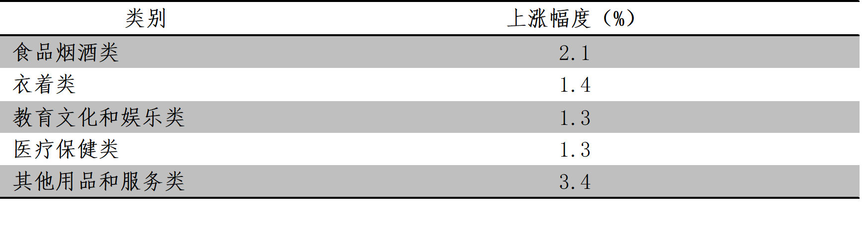 漲幅超過CPI同比上漲0.6%的類別共有5類,即食品煙酒類價格同比上漲2.1%,衣著類上漲1.4%,教育文化和娛樂類上漲1.3%,醫(yī)療保健類上漲1.3%,其他用品和服務(wù)類上漲3.4%。