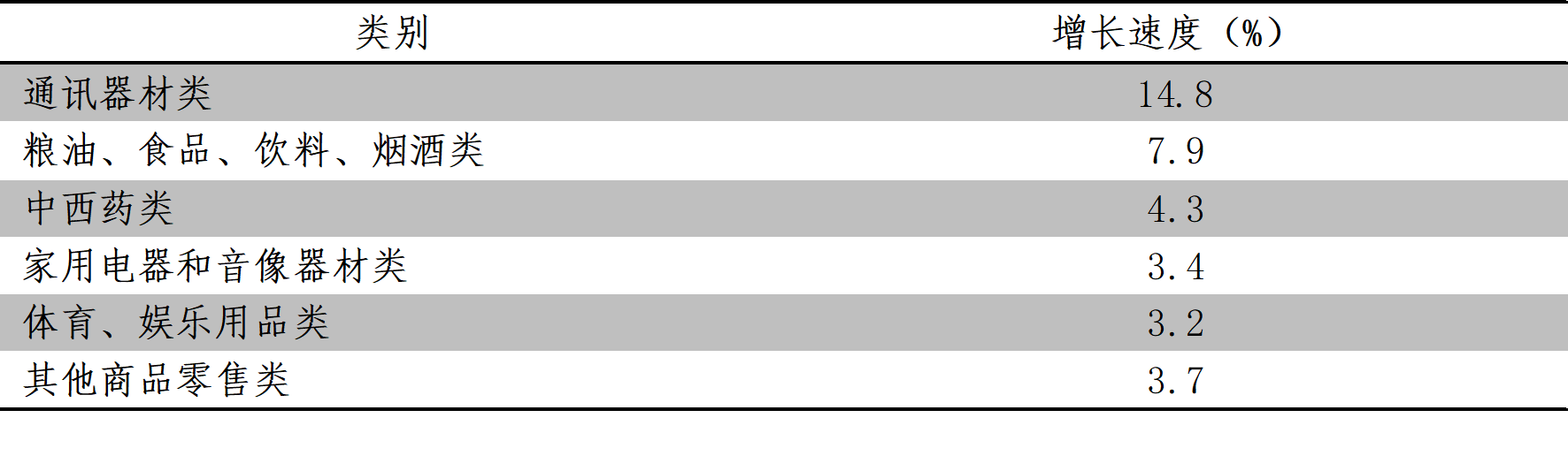 8月份,限額以上單位商品零售額增速快于消費(fèi)品零售總額2.1%增速的共有6類,即通訊器材類同比增長14.8%,糧油、食品、飲料、煙酒類增長7.9%,中西藥類增長4.3%,家用電器和音響汽車類增長3.4%,體育、娛樂用品類增長3.2%,其他商品零售類增長3.7%。