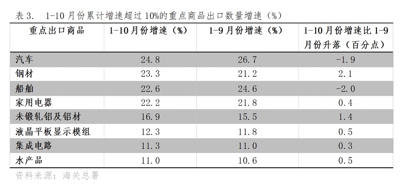 1-10月份,累計出口數量增長速度超過10%的重點商品共有8類,與1-9月份持平,其中6類增速回升,2類增速回落,即汽車出口增長24.8%,鋼材出口增長23.3%,船舶出口增長22.6%,家用電器出口增長22.2%,未鍛軋鋁及鋁材出口增長16.9%,液晶平板顯示模組出口增長12.3%,集成電路出口增長11.3%,水產品出口增長11.0%。