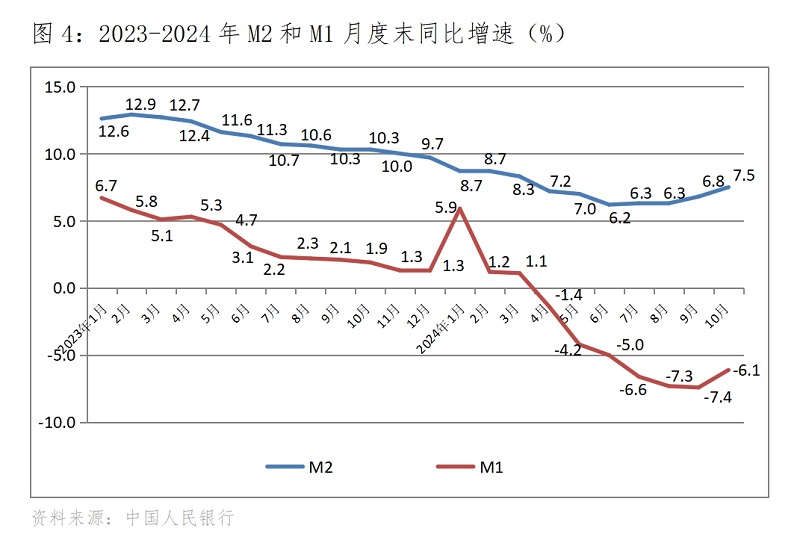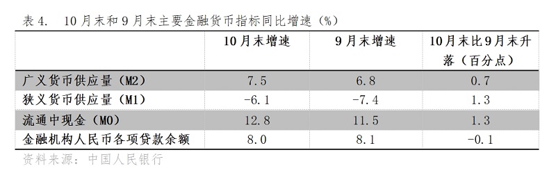 (四)M2增速持續(xù)回升。10月末,廣義貨幣供應量(M2)同比增長7.5%,比9月末增長6.8%回升0.7個百分點,9月末增速比8月末增速回升了0.5個百分點;狹義貨幣供應量(M1)降幅由擴大轉為縮小,10月末同比下降6.1%,比9月末下降7.4%縮小1.3個百分點,而9月末降幅比8月末降幅擴大0.1個百分點,扭轉了自5月末以來降幅逐月擴大的趨勢;流通中貨幣(M0)增速由落轉升,10月末同比增長12.8%,比9月末增長11.5%回升了1.3個百分點,而9月末增速比8月末增速回落了0.7個百分點。貨幣供應量增速的回升或降幅的縮小,對經濟回升將發(fā)揮著積極的重要作用。