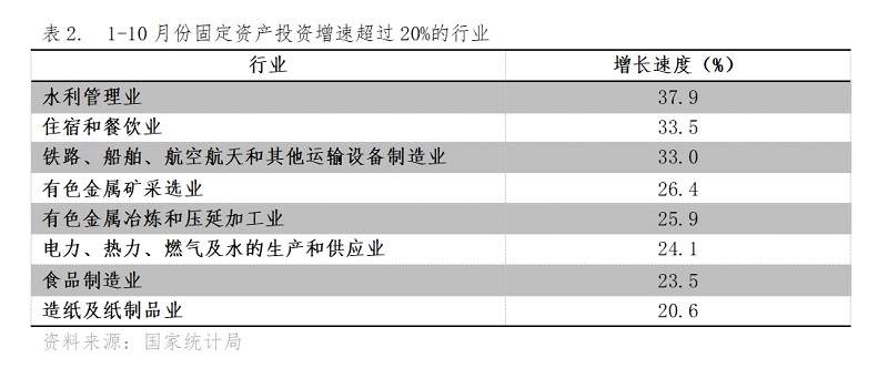 1-10月份,固定資產投資增速超過20%的行業(yè)共8個,即水利管理業(yè)增長37.9%,住宿和餐飲業(yè)增長33.5%,鐵路、船舶、航空航天和其他運輸設備制造業(yè)增長33.0%,有色金屬礦采選業(yè)增長26.4%,有色金屬冶煉和壓延加工業(yè)增長25.9%,電力、熱力、燃氣及水的生產和供應業(yè)增長24.1%,食品制造業(yè)增長23.5%,造紙及紙制品業(yè)增長20.6%。