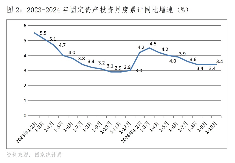 (二)投資增速持續(xù)持平。1-10月份,固定資產投資同比增長3.4%,與1-9月份增長3.4%持平,1-8月份也是增長3.4%,投資增速扭轉了此前連續(xù)5個月的回落,保持了連續(xù)3個月的持平。國有控股投資增速略有回升,1-10月份比1-9月份回升0.1個百分點;民間投資降幅略有擴大,1-10月份比1-9月份擴大0.1個百分點。三次產業(yè)投資中,第一產業(yè)投資增速回升0.2個百分點,第二產業(yè)投資增速回落0.1個百分點,第三產業(yè)投資降幅擴大0.2個百分點。