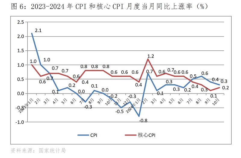 (二) CPI漲幅繼續(xù)回落。10月份,CPI同比上漲0.3%,比9月份上漲0.4%回落了0.1個百分點,而9月份比8月份回落0.2個百分點,延續(xù)了上月回落的態(tài)勢。其中食品價格上漲2.9%,比上月上漲3.3%回落0.4個百分點;非食品價格下降0.3%,比上月下降0.2%擴大0.1百分點。10月份,核心CPI同比上漲0.2%,比9月份上漲0.1%回升了0.1個百分點。CPI和核心CPI漲幅,雖然比上月一落一升,但由于漲幅都仍還比較低,說明市場需求仍還較為疲弱。