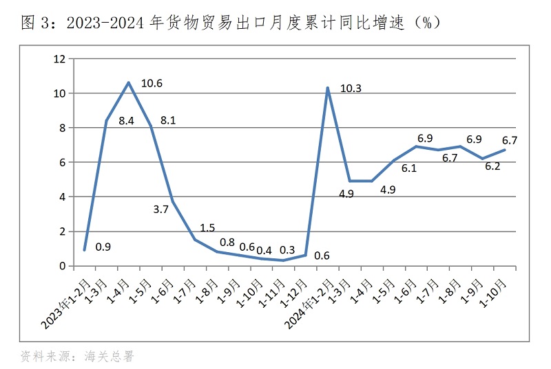 (三)貨物出口增速由落轉升。1-10月份,貨物出口同比增長6.7%,比1-9月份增長6.2%回升0.5個百分點,1-9月份比1-8月份回落0.7個百分點,呈現出增速由降轉升的態(tài)勢。貨物出口對主要貿易出口經濟體增速全面回升,1-10月份對歐盟出口增長3.5%,比1-9月份回升0.8個百分點;對美國出口增長4.9%,比1-9月份回升0.3個百分點;對東盟出口增長12.5%,比1-9月份回升0.2個百分點;對拉丁美洲出口增長14.5%,比1-9月份回升0.8個百分點。
