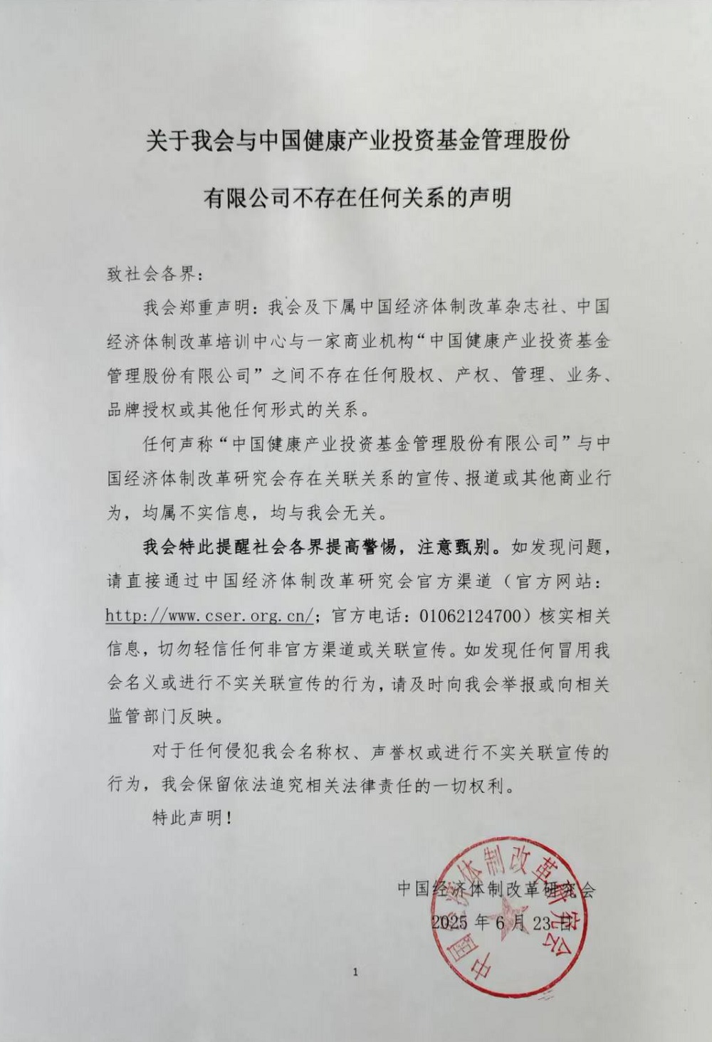 我會鄭重聲明:我會及下屬中國經(jīng)濟(jì)體制改革雜志社、中國經(jīng)濟(jì)體制改革培訓(xùn)中心與一家商業(yè)機(jī)構(gòu)“中國健康產(chǎn)業(yè)投資基金管理股份有限公司”之間不存在任何股權(quán)、產(chǎn)權(quán)、管理、業(yè)務(wù)、品牌授權(quán)或其他任何形式的關(guān)系。